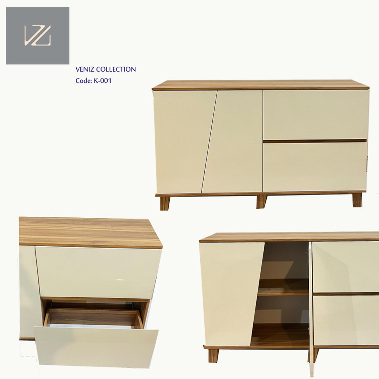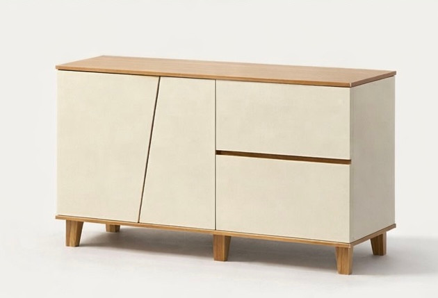 The angled-door console in white and natural wood finish delivers a refined, minimalist luxury aesthetic